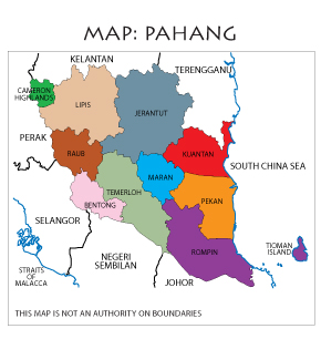 Pahang, the largest state in Peninsular Malaysia with a land mass of 35,960 sq. km. is endowed with a diverse range of attractions. Almost two-third of the State is shrouded in extensive rainforest, making it a charming support of lush greenery, exotic wildlife and nature's wonders.