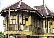 Solid wood was used to build to the palace with the exception of the roof that was built using the waterproof 'kayu berlian' or diamond wood. In true patriotic fashion, the palace was painted in the three official colours of the Perak flag - white, yellow and black that represent the three branches of the royal family. Woven sliced 'bertam' or bamboo with diamond shaped motifs line the inner palace walls. Also particularly unique are the doors at the top of its stairs, which are set horizontally rather than vertically.